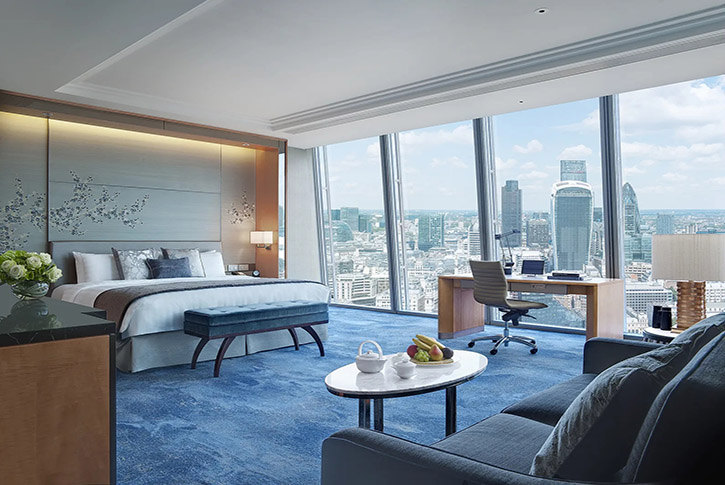 There’s no better way to experience London from above than by staying in the iconic Shangri-La Hotel, located on the 34th to 52nd floors of The Shard. As one of the tallest buildings in Europe, the views here are unparalleled. The hotel’s rooms are designed with floor-to-ceiling windows that provide guests with a panoramic view of the entire city. You can see everything from the River Thames snaking through the city to the London Eye, St. Paul’s Cathedral, and beyond.